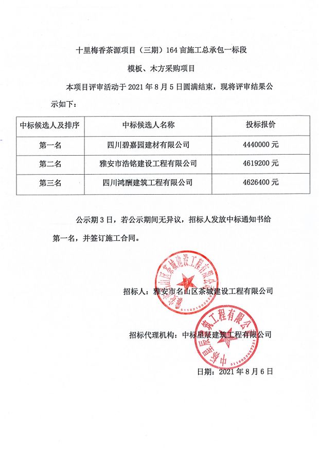 十里梅香茶源小鎮(zhèn)(三期)164畝施工總承包一標段模板、木方采購中標公示