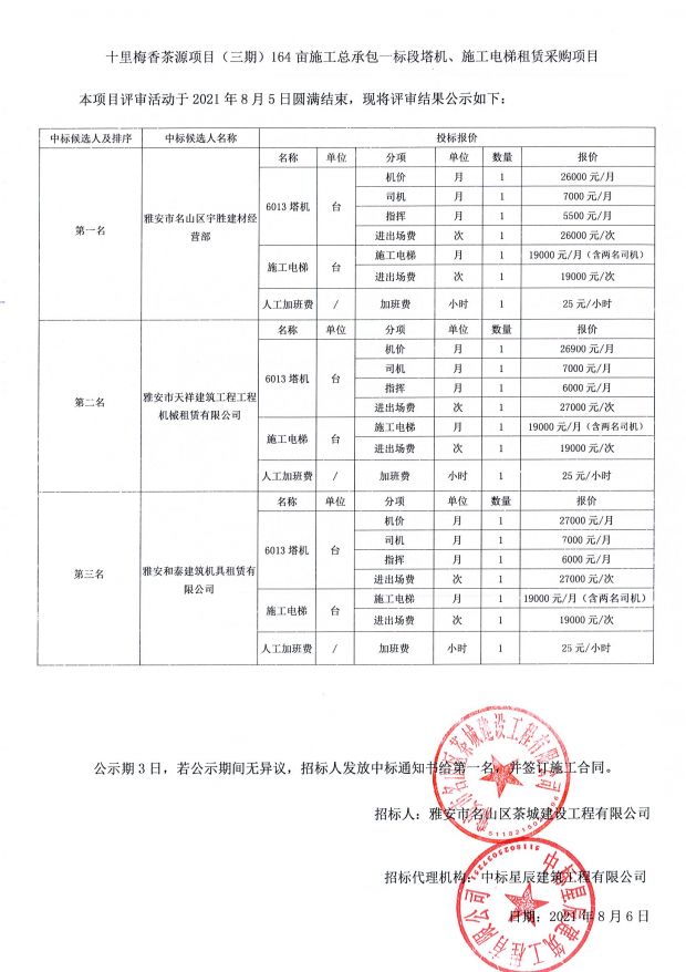 十里梅香茶源項目(三期)164畝施工總承包一標(biāo)段塔機、施工電梯租賃采購中標(biāo)公示